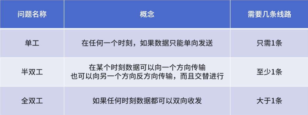 在任何一个时刻,如果数据只能单向发送,就是单工,所以单工需要至少一条线路。如果在某个时刻数据可以向一个方向传输,也可以向另一个方向反方向传输,而且交替进行,叫作半双工;半双工需要至少 1 条线路。最后,如果任何时刻数据都可以双向收发,这就是全双工,全双工需要大于 1 条线路。当然这里的线路,是一个抽象概念,你可以并发地处理信号,达到模拟双工的目的。