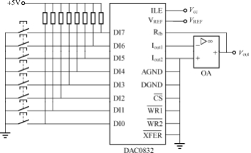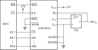 在图5-45中,由于WR2和XFER均为低电平,所以8位DAC寄存器处于直通方式;而CS和WR1引脚分别与8051单片机的P2.7和WR引脚相连,使得单片机可以通过指令控制8位输入寄存器。