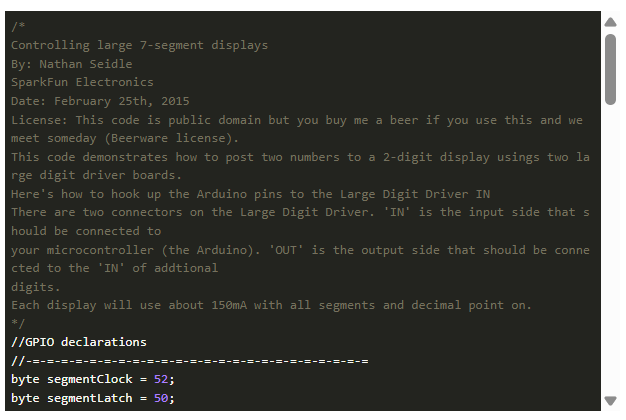 游戏开始前会出现5秒倒计时。游戏在这个倒计时后开始,另一个15秒倒计时从那里开始。在这段时间里,你必须尽可能多地打汽缸。在第二次倒计时结束时,你的最终得分显示-所有这些都是使用7段显示。为了测试这两个7段数字,我们使用了下面的示例代码。我们所做的唯一修改是将引脚分配更改为50 (segmentLatch), 51 (segmentData)和52 (segmentClock)。