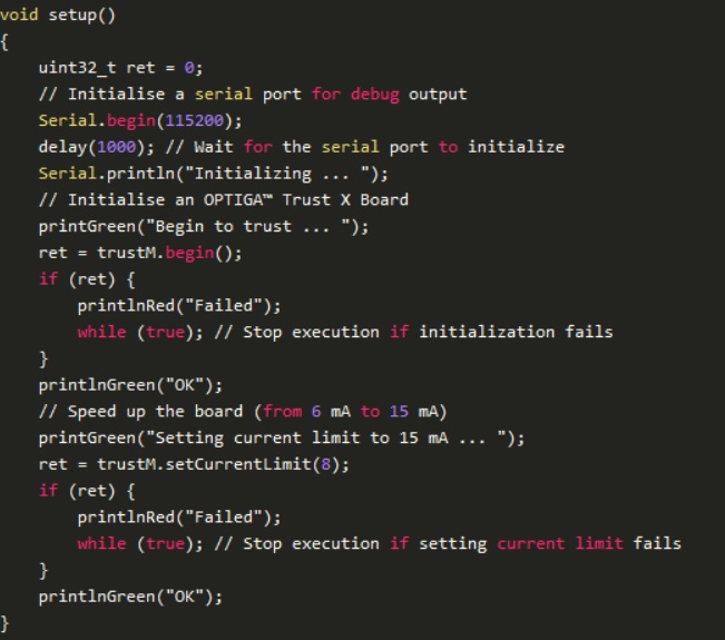 我们首先修改Optiga™Trust M Arduino库中的一个示例,使其适应我们的需求。首先,让我们看一下这段代码的基础: