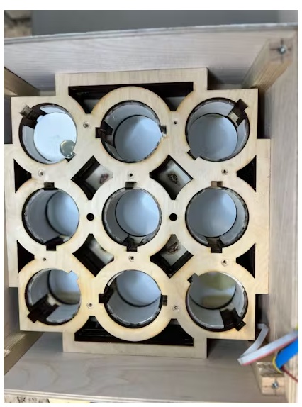接下来,我们放置9个活塞垫,拧紧支撑活塞的木板。这块板作为运动活塞和气动系统之间的中间层。最后,你可以把活塞系统安装到气动系统上,就可以进行测试了。