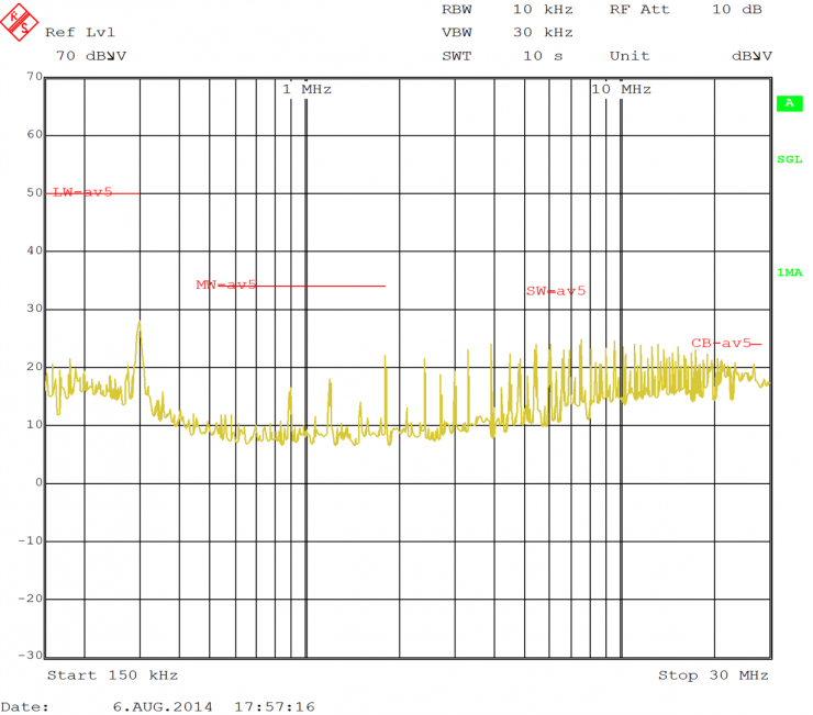 图 2:使用集群电源参考设计在 150kHz 至 30MHz 范围内传导 EMC。