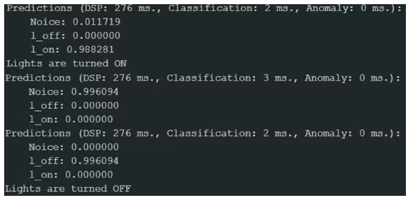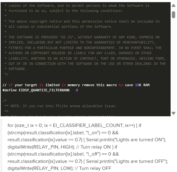 这部分代码遍历机器学习模型输出的每个预测(或标签)。对于每个标签,它首先检查标签是否为“l_on”(意思是“灯亮”),以及模型对该标签的置信度是否为70%或更高。如果两个条件都为真,它打印“灯已打开”到串行监视器,然后发送一个高信号到继电器引脚,它打开连接的灯。同样,它检查标签是否为“l_off”(意思是“关灯”),以及置信度是否至少为70%。如果是,它打印“灯已关闭”,并发送一个低信号到继电器,关闭灯。这种逻辑允许系统对模型识别的特定语音命令做出反应,并相应地控制灯光,但前提是模型对听到的声音有足够的信心