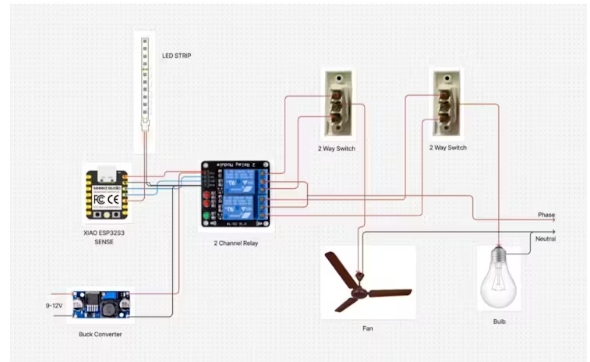 该电路由XIAO ESP32S3感测微控制器、2通道继电器模块、降压转换器以及风扇、灯泡和LED灯带等常见家用设备组成。一个9-12V的电源被送入降压转换器,降压转换器将其降压至5V,为ESP32S3和继电器模块供电。ESP32S3通过VCC、GND和GPIO控制引脚连接到继电器模块。这些控制引脚作为信号线来激活继电器。继电器输出连接到风扇和灯泡,使交流电源通过继电器接通或关闭。此外,双向开关与继电器并联连接,无论智能系统状态如何,都可以手动控制设备。