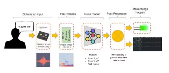 •TinyML模型处理音频输入并检测特定的关键字。