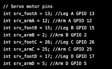 在本节中,我们指定伺服电机连接的GPIO引脚。机器人的每条手臂和腿都由单独的伺服电机控制。