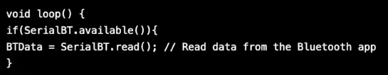 在循环部分,代码检查是否从蓝牙应用程序接收到任何数据。如果数据可用,则读取数据并将其存储在data变量中。基于这些数据,触发特定的机器人功能。