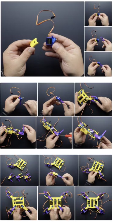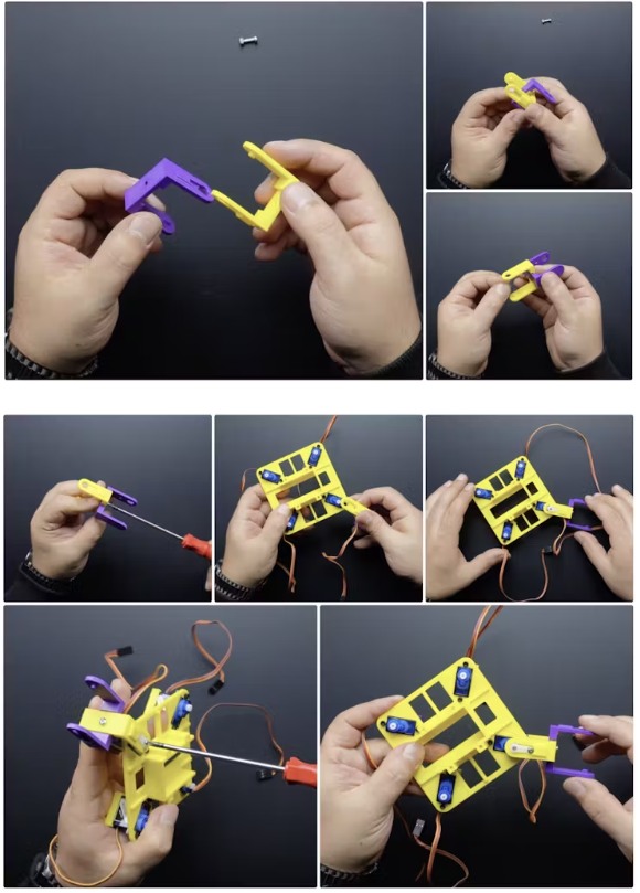 在本节中,将由两个独立部分组成的“臂”和“腿”连接器用螺栓和螺母固定在一起。将固定连接器连接到伺服基座上。然后,与连接器成对角角,放置伺服喇叭,拧紧螺丝固定在伺服电机上。