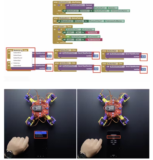 该应用程序通过蓝牙发送指定的数字来激活生成的命令,如上下行走等。这些数字在应用程序中定义,命令在代码中被解释以触发不同的机器人动作。
