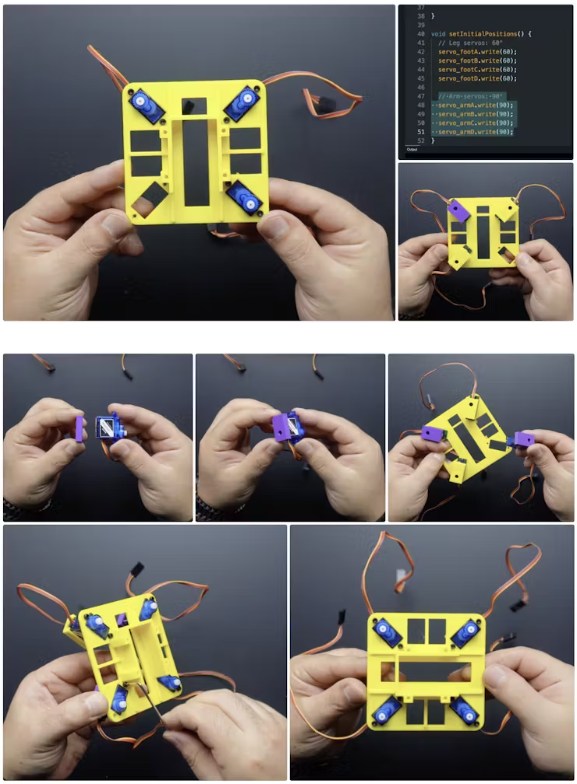 在固定要在腿上使用的伺服电机之前,您需要将它们带到60度的起始角度。然后放置支架和支腿部分,用合适的螺钉将支腿部分固定在伺服电机上。