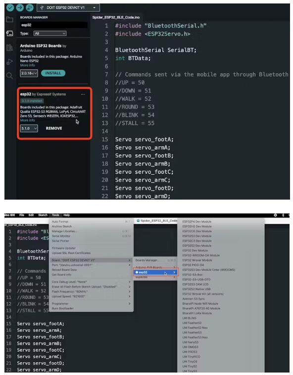 当接收到命令时,机器人会执行诸如行走-旋转或重置到稳定位置之类的动作。这就是代码的工作原理和要求,现在将代码上传到板子上,然后让我们转到应用程序端。