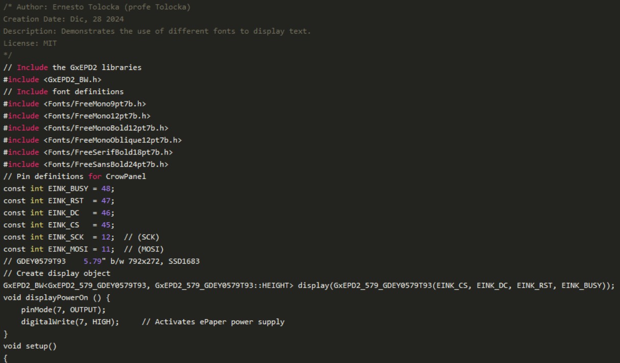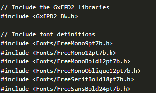 在代码的第一行中,我们发现了几个#include指令。第一个集成了GxEPD2库,特别是为单色显示设计的版本(因此添加了BW)。下面的#include指令用于加载字体定义,稍后我们将使用这些定义在屏幕上显示文本。