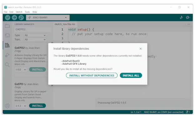 由于GxEPD2依赖于Adafruit_GFX,您只需要直接安装GxEPD2。在安装过程中,IDE将检测依赖项并提示您安装Adafruit库。此时,只需确认并继续安装即可。