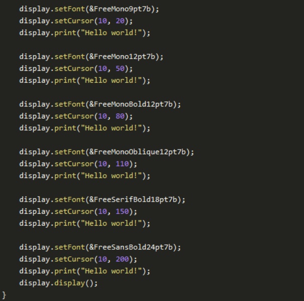 最后,有几个块使用不同的字体显示文本:setFont指定要使用的字体或字体,setCursor将光标定位在所需的位置(原点(0,0)位于左上角),print将文本输出到屏幕上。
