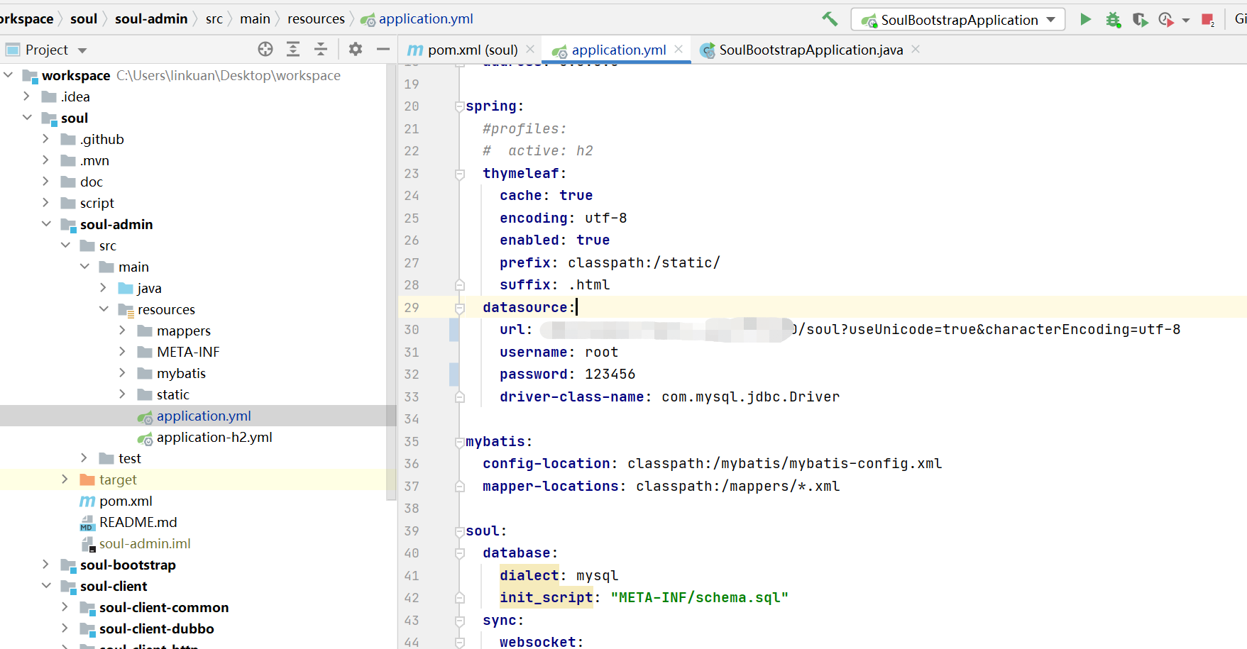 (3)修改soul-admin目录下的文件, 在application.yml中添加自己的数据库链接。