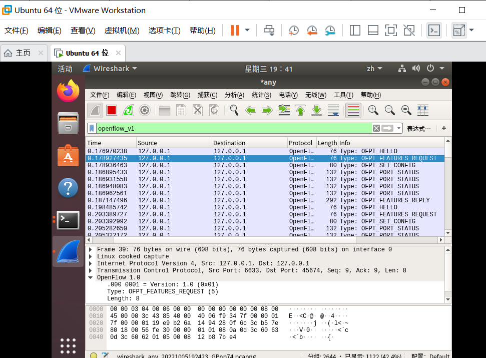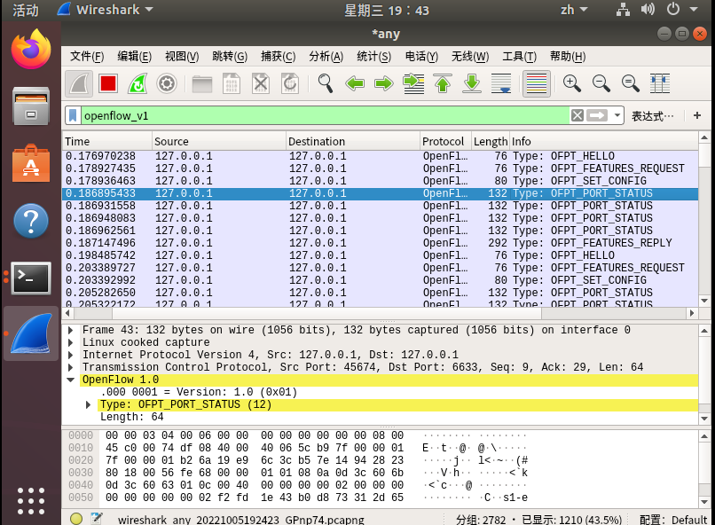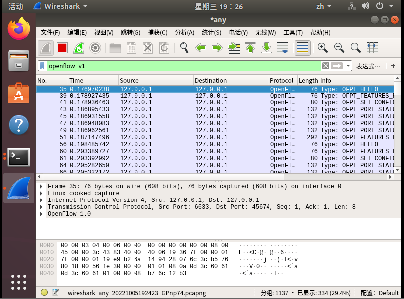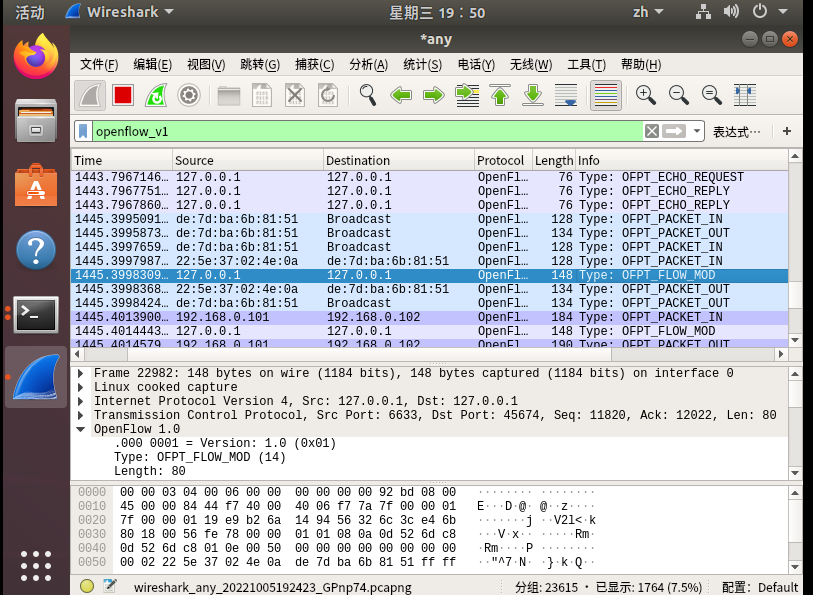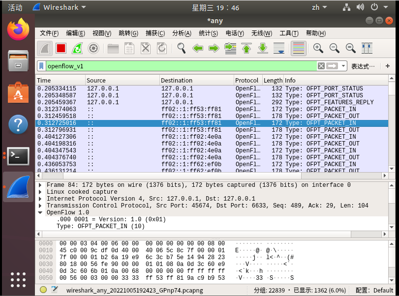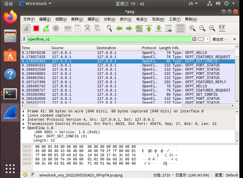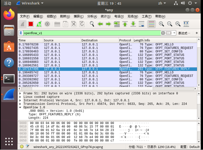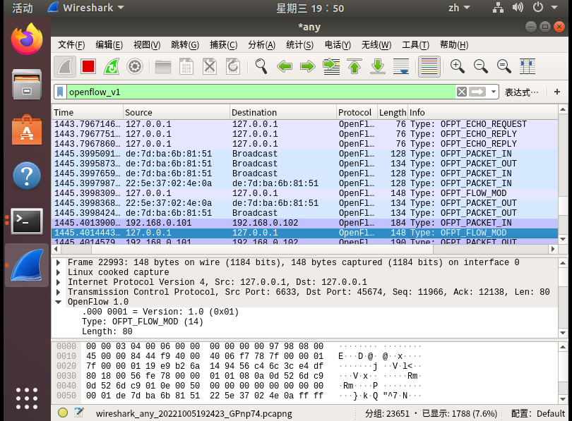 分析抓取的flow_mod数据包,控制器通过6633端口向交换机45674端口