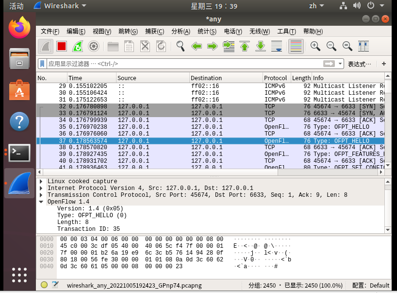 能够运用 wireshark 对 OpenFlow 协议数据交互过程进行抓包;