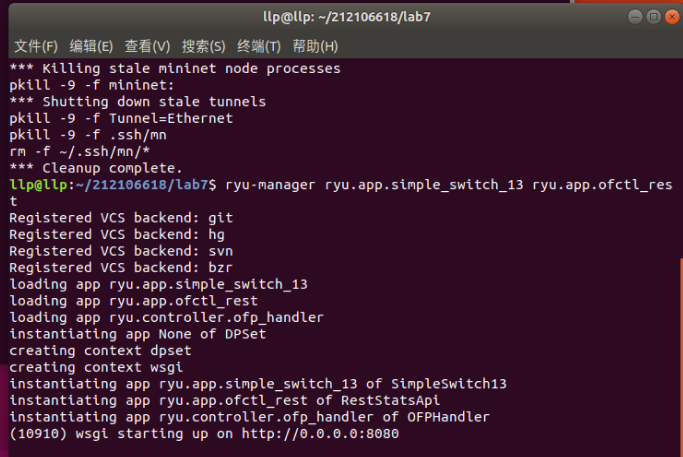 ryu-manager ryu.app.simple_switch_13 ryu.app.ofctl_rest打开Ryu控制器 -