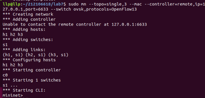 sudo mn --custom topo.py --topo mytopo --mac --controller=remote,ip=127.0.0.1,port=6633 --switch ovsk,protocols=OpenFlow13创建拓扑 -