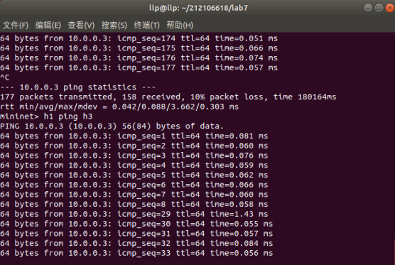 h1 ping h3,同时运行ryu硬超时运行ryu_timeout,h1 ping h3中断20秒