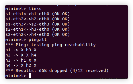 #ryu_topo.pyfrommininet.topoimportTopoclassMyTopo(Topo):def__init__(self):# initilaize topologyTopo.__init__(self)self.addSwitch("s1")self.addSwitch("s2")self.addHost("h1")self.addHost("h2")self.addHost("h3")self.addHost("h4")self.addLink("s1","h1")self.addLink("s1","h2")self.addLink("s2","h3")self.addLink("s2","h4")self.addLink("s1","s2")topos={'mytopo': (lambda: MyTopo())}-