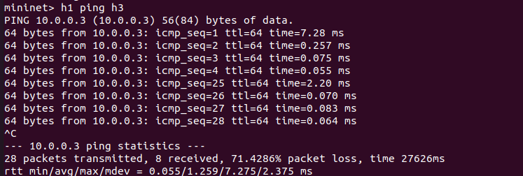 (3) 下发硬超时流表,实现拓扑内主机h1和h3网络中断20s。timeout.py