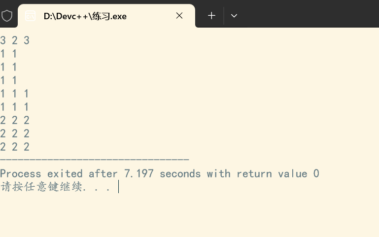 首先,程序通过是scanf函数读取两个矩阵的尺寸和元素。接着,根据输入内容建立两个矩阵,通过矩阵的特性可知,需要双重循环来存入数组q1,q2,两个矩阵进行相乘,由于矩阵相乘规则可知,需要行和列的对应值相乘再相加(例如:第一个矩阵的第0行的值乘第2个矩阵的第0列的值,相加,之后是,第一个矩阵的第0行的值乘第2个矩阵的第1列的值,相加,如此往复),这需要通过三层嵌套循环来实现此功能。因后续不需要用这个结果,可以不需要用数组来储存结果,占据内存,可以相加后直接输出结果,并用k来判断这个输出结果是否需要换行,使得每行输出矩阵的一行元素,且元素之间以空格分隔。
