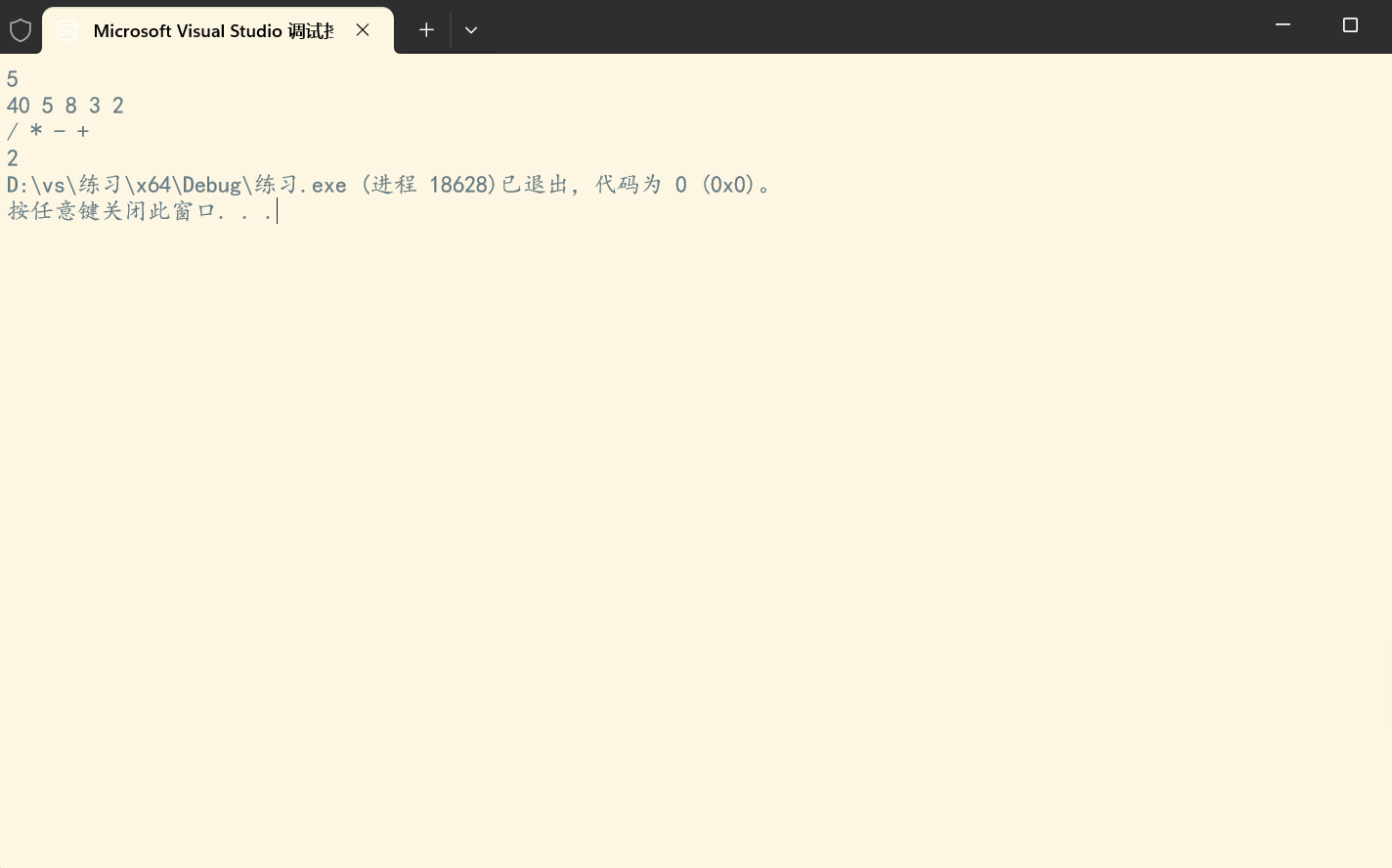 将输入的数字和运算符按给定顺序分别压入堆栈 S 1和 S 2,将执行计算的最后结果输出。注意所有的计算都只取结果的整数部分。题目保证计算的中间和最后结果的绝对值都不超过 10^9。
