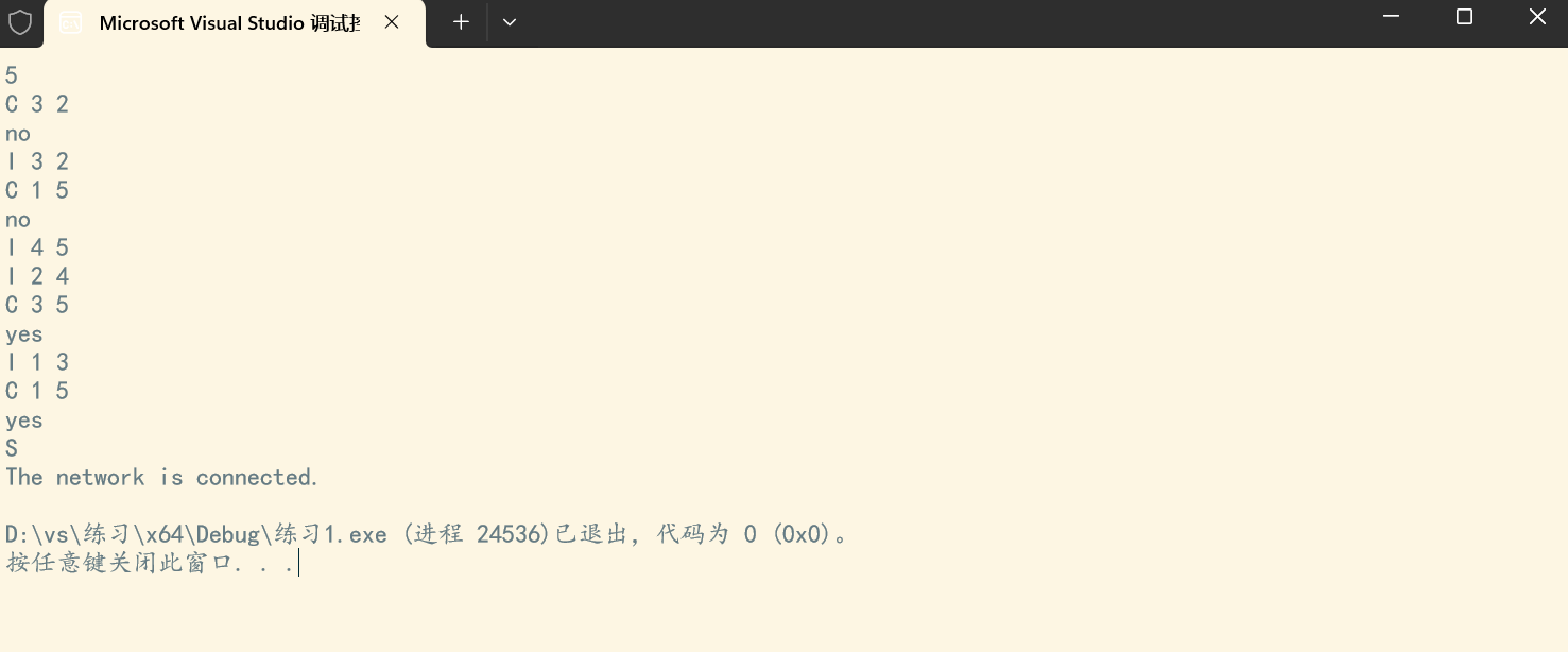 对每个C开头的查询,如果c1和c2之间可以传输文件,就在一行中输出"yes",否则输出"no"。当读到终止符时,在一行中输出"The network is connected."如果网络中所有计算机之间都能传输文件;或者输出"There are k components.",其中k是网络中连通集的个数。