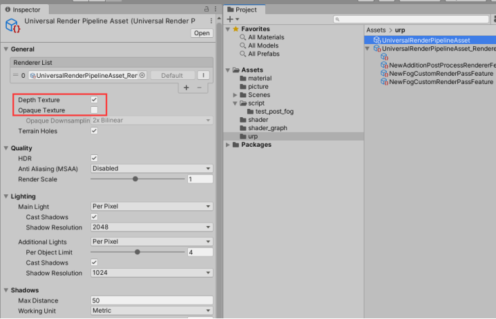 选中创建出来的urp assert,把Depth Texture 和 Opaque Texture根据需要勾上,引处勾上Depth,因为大部分后处理会用到