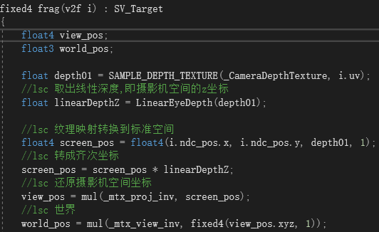 网上找到的基本是要计算摄影机边界的4条射线,然后标准化插值后射线方向,利用深度还原场景的世界坐标,代码比较繁琐,要向shader多传递4条射线参数