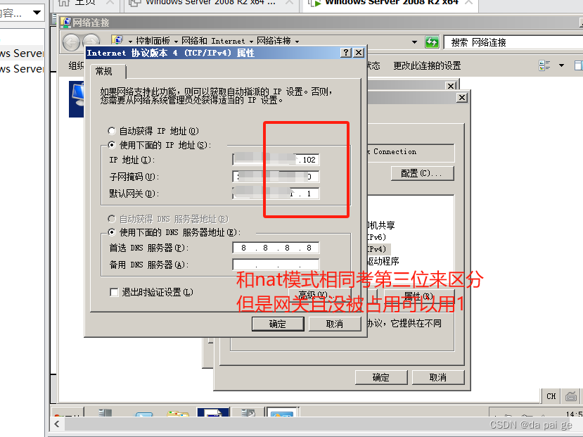 IP地址: 192.168.。.。 . (2 - 254) ps(1被网卡占了,网关无法使用)