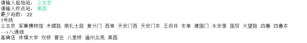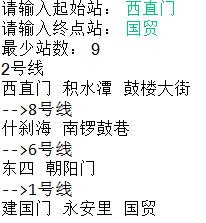 提供一副地铁线路图,计算指定两站之间最短(最少经过站数)乘车路线;输出指定地铁线路的所有站点。以北京地铁为例,地铁线路信息保存在data.txt中,格式如下: