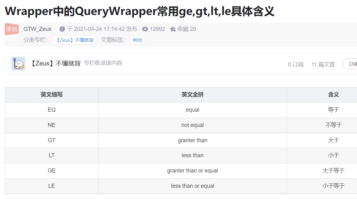 (19条消息) Wrapper中的QueryWrapper常用ge,gt,lt,le具体含义_GTW_Zeus的博客-CSDN博客_querywrapper.le
