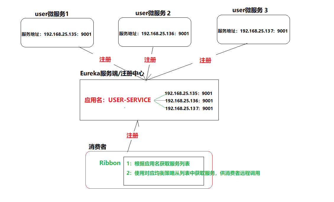 1):user微服务1、user微服务2、user微服务3是一个服务集群,它们都会向注册中心注册服务(它们的应用名都是USER-SERVICE)