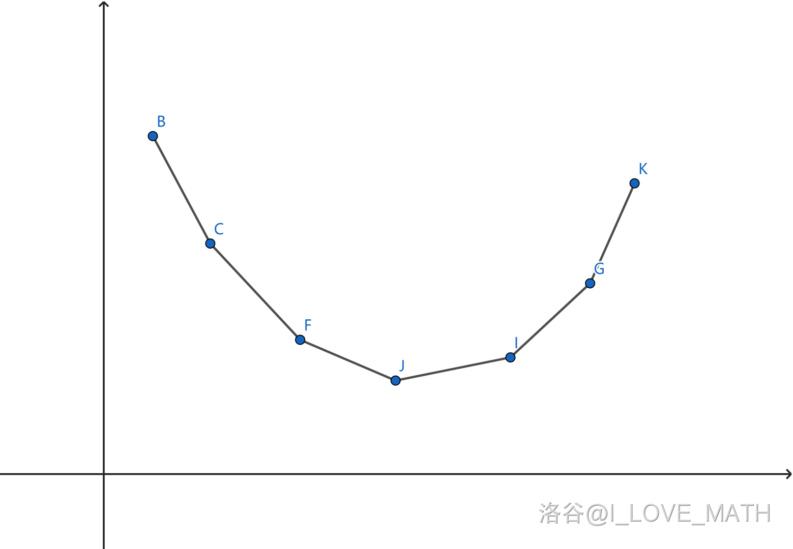删去所有不可能为最优的决策点,发现可能为最优解的点会形成如下的一个下凸包:
