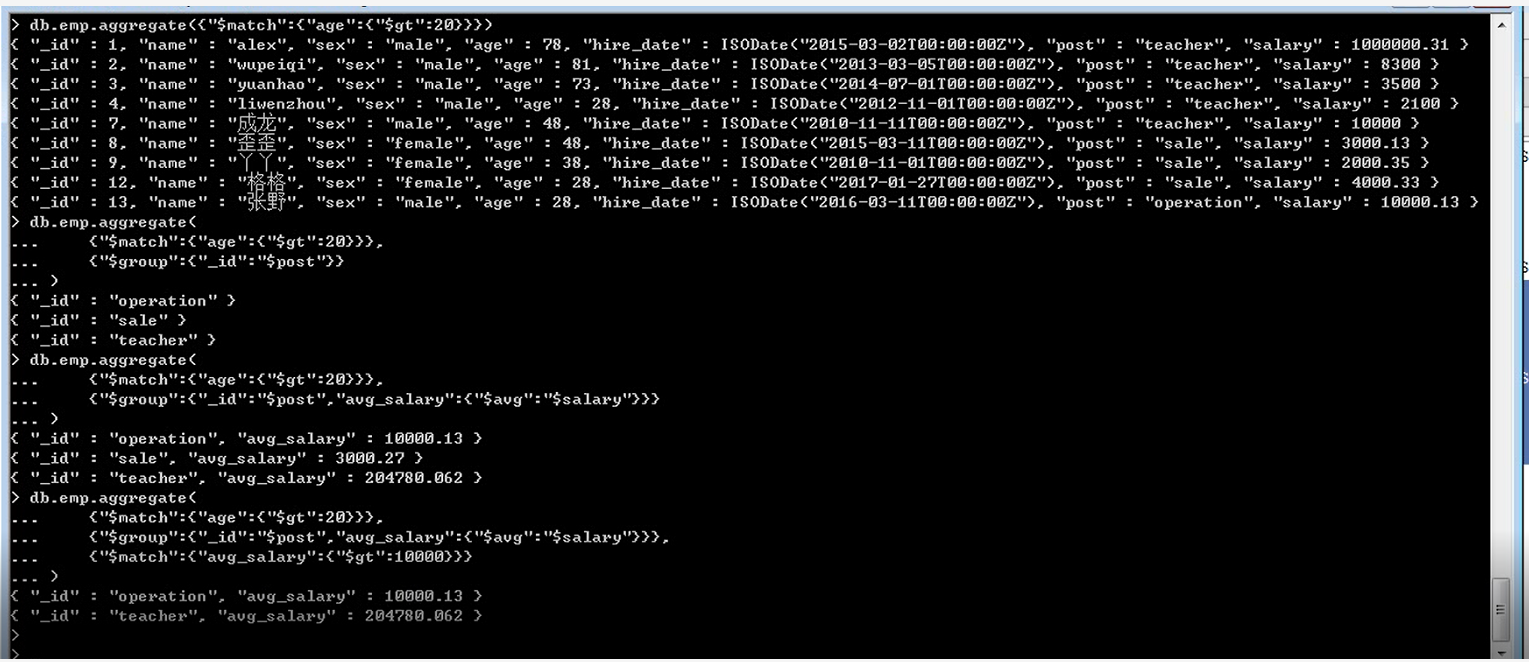 过滤 $match 在mysql中:select * from db1.emp where age > 20; db.emp.aggregate({"$match":{"age":{"$gt":20}}}) 分组 $group 在mysql中:select * from db1.emp where age > 20 group by post; db.emp.aggregate( {"$match":{"age":{"$gt":20}}}, {"$group":{"_id":"$post"}} # _id分组依据。注意不是默认的表的_id区分。$post,取post字段的value值 ) 再算出平均工资 db.emp.aggregate( {"$match":{"age":{"$gt":20}}}, {"$group":{"_id":"$post","avg_salary":{"$avg":"$salary"}}} ) # 再过滤出平均工资大于10000的 db.emp.aggregate( {"$match":{"age":{"$gt":20}}}, {"$group":{"_id":"$post","avg_salary":{"$avg":"$salary"}}}, {"$match":{"avg_salary":{"$gt":10000}}} )