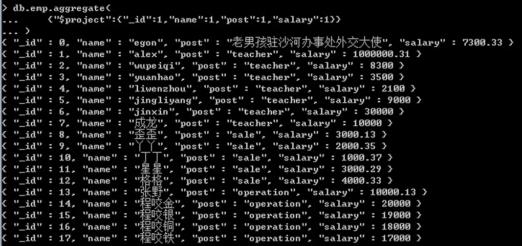 # 将名字变为大写 db.emp.aggregate( {"$project":{"_id":0,"new_name":{"$toUpper":"$name"}}} ) # 过滤出除了egon的,其他的名字后缀都加 _SB db.emp.aggregate( {"$match":{"name":{"$ne":"egon"}}}, {"$project":{"_id":0,"new_name":{"$concat":["$name","_SB"]}}} ) # 取出名字的前3个字节,是以utf8做的编码。必须是以3的倍数取值 db.emp.aggregate( {"$match":{"name":{"$ne":"egon"}}}, {"$project":{"_id":0,"new_name":{"$substr":["$name",0,3]}}} )