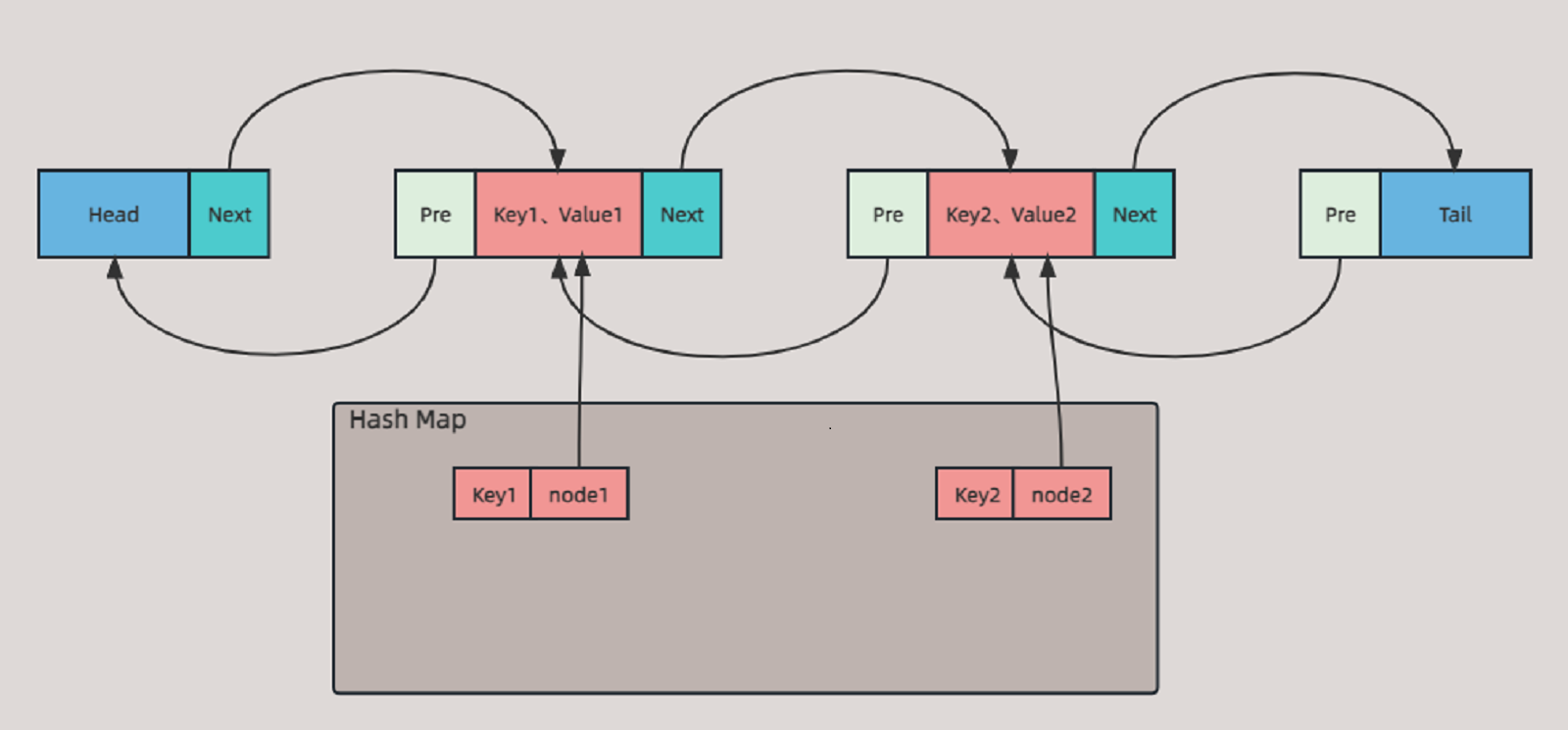 然后上面的 map 的 key 为用户传入的 key,map 的 value 为双链表的中 node,即通过 key 来获取链表中的 node,node 里存有用户传的 value