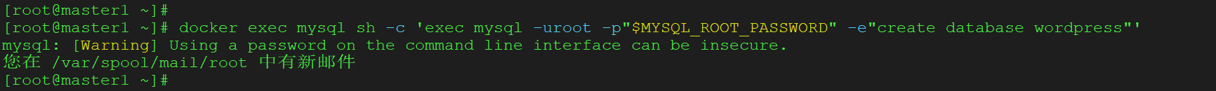 docker exec mysql sh -c 'exec mysql -uroot -p"$MYSQL_ROOT_PASSWORD" -e"create database wordpress"'