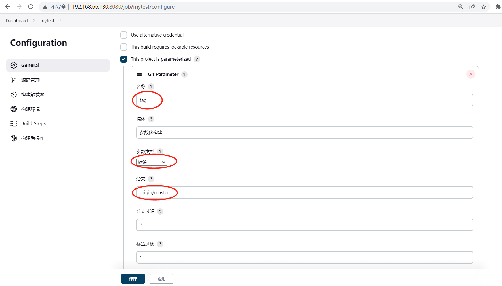 进入要构建的项目,选择配置---》选中 “This project is parameterized”---->名称 输入“tag”-------> 参数类型选择 -- “标签”