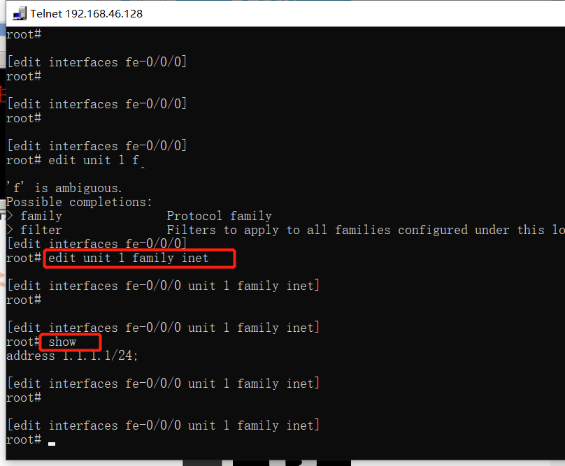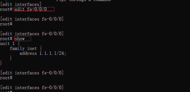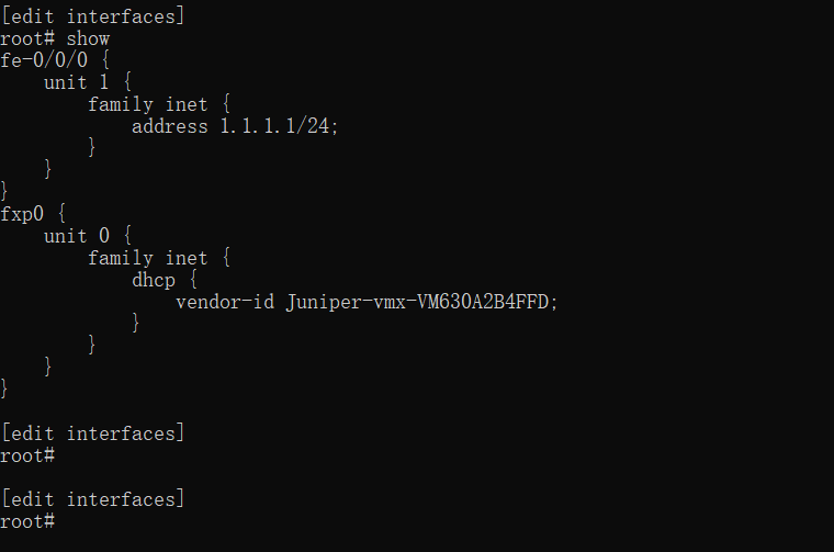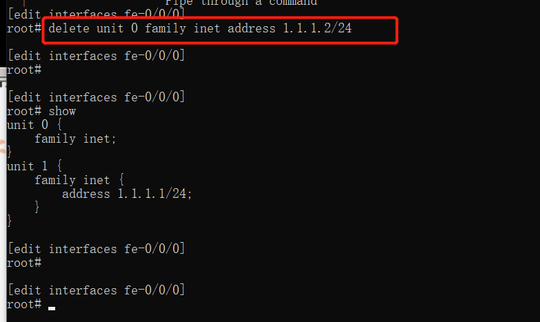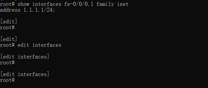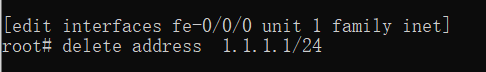 root# set interfaces fe-0/0/0.1 family inet address 1.1.1.1/24