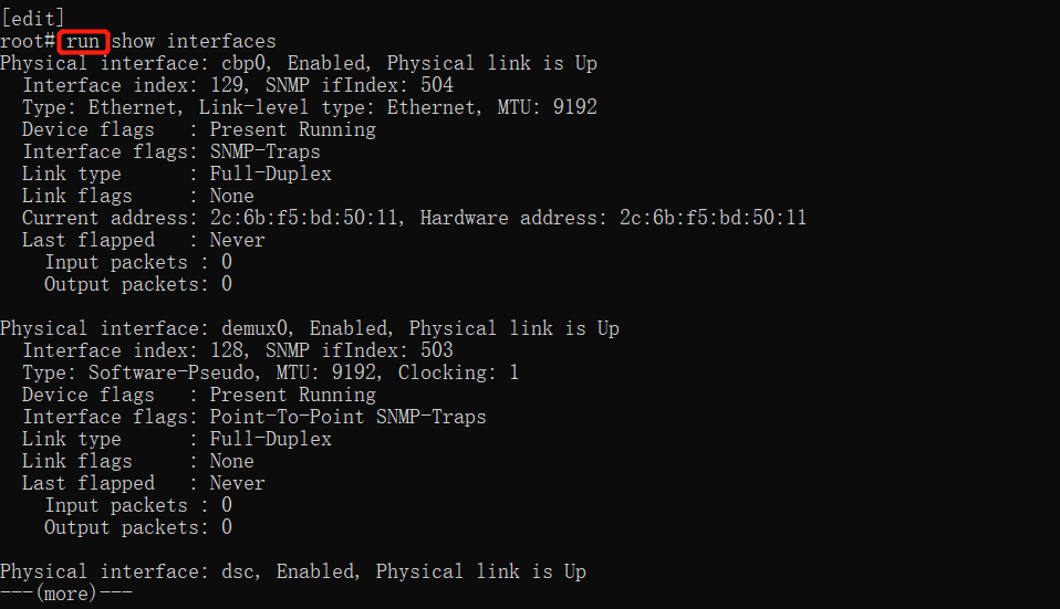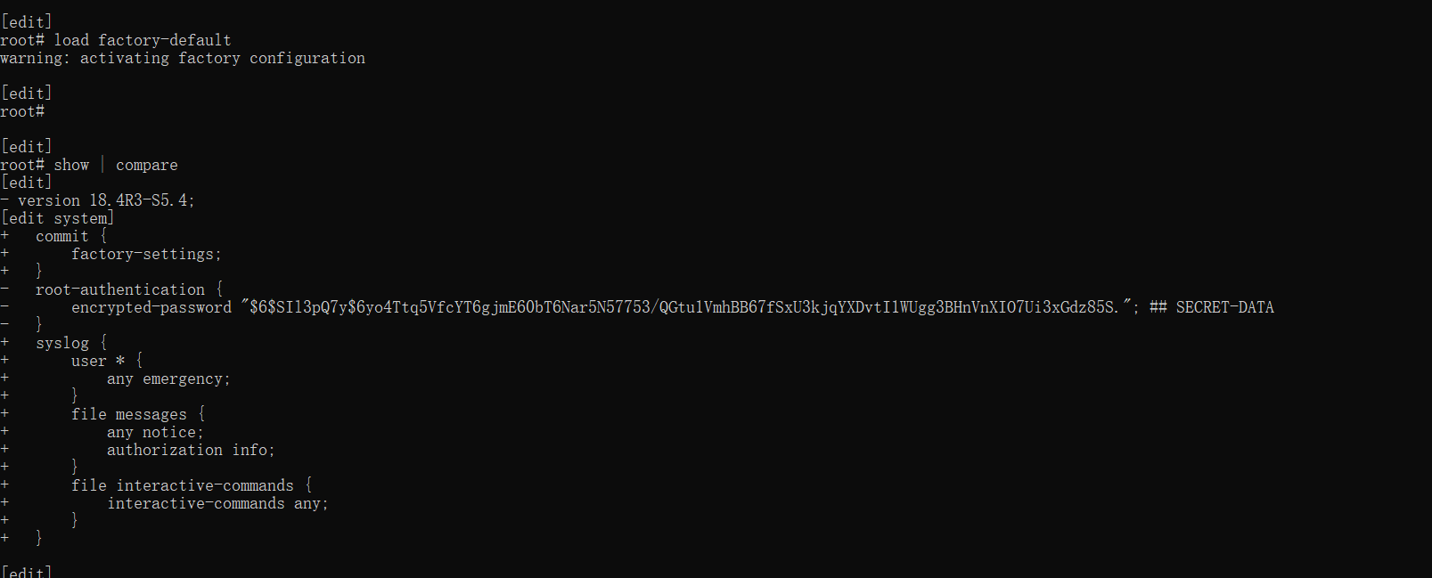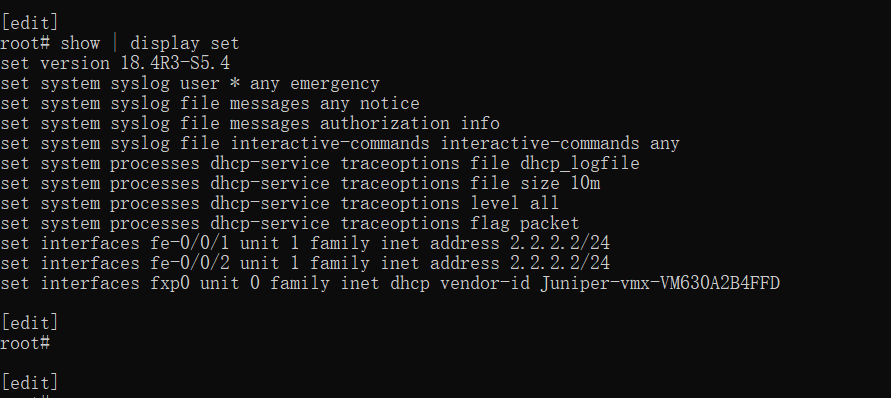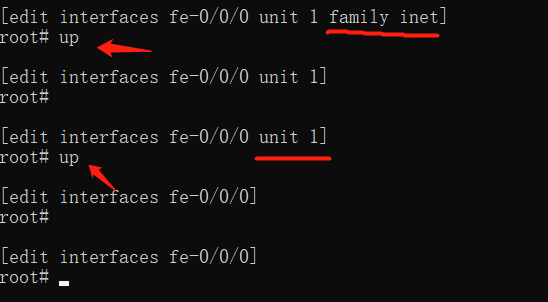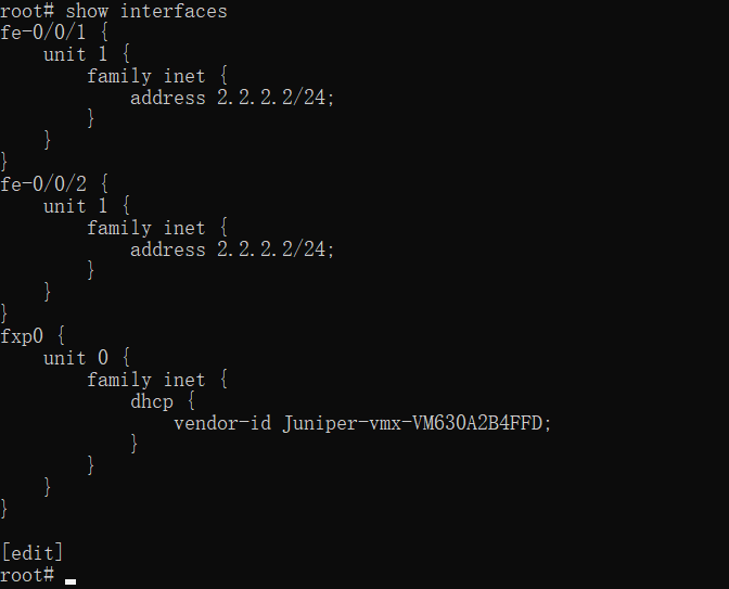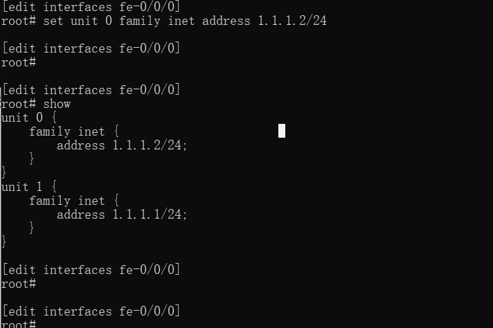 root# set interfaces fe-0/0/0 unit 1 family inet address 2.2.2.2/24