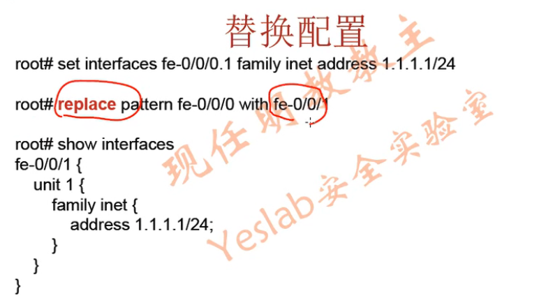 root# replace pattern fe-0/0/0 with fe-0/0/1