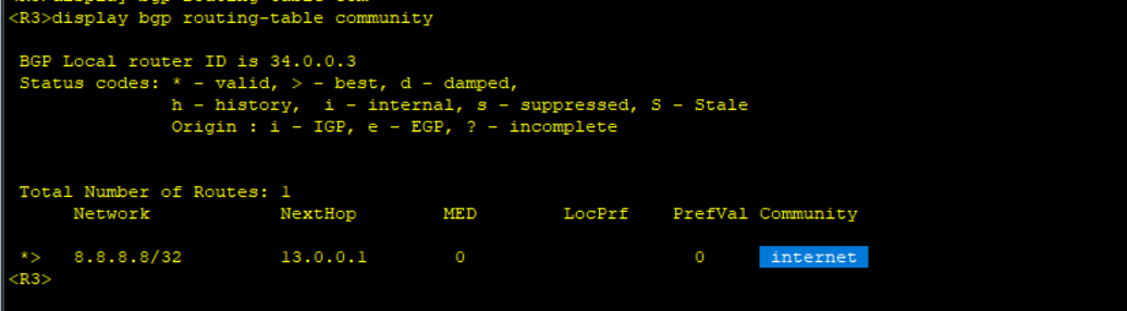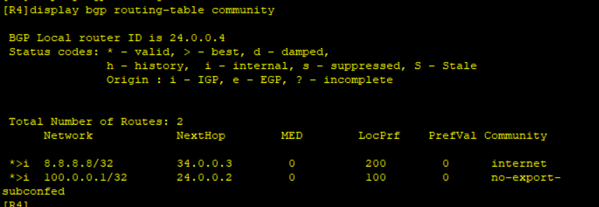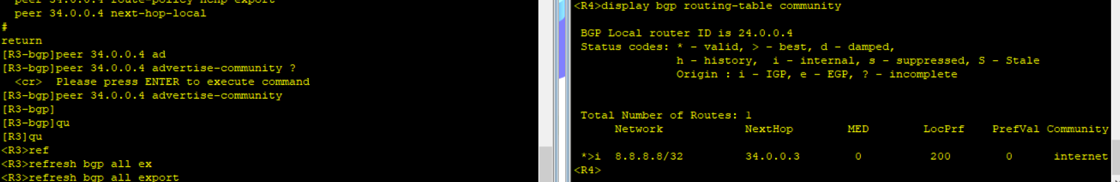 R3若想转发团体属性给R4 需要 R3上也配 peer 34.0.0.4 adver