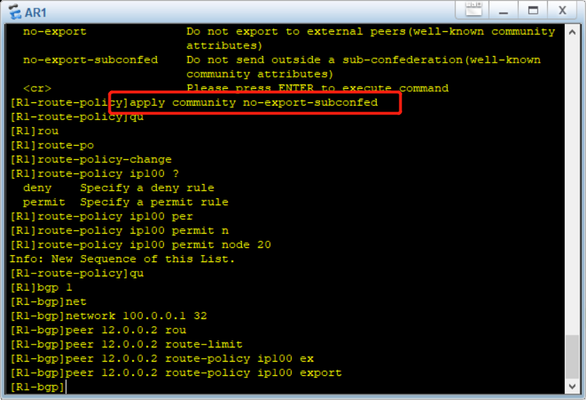 no-export-sub 属性R1上设置策略路由属性可以传给R3-->R4,但不会传给R5