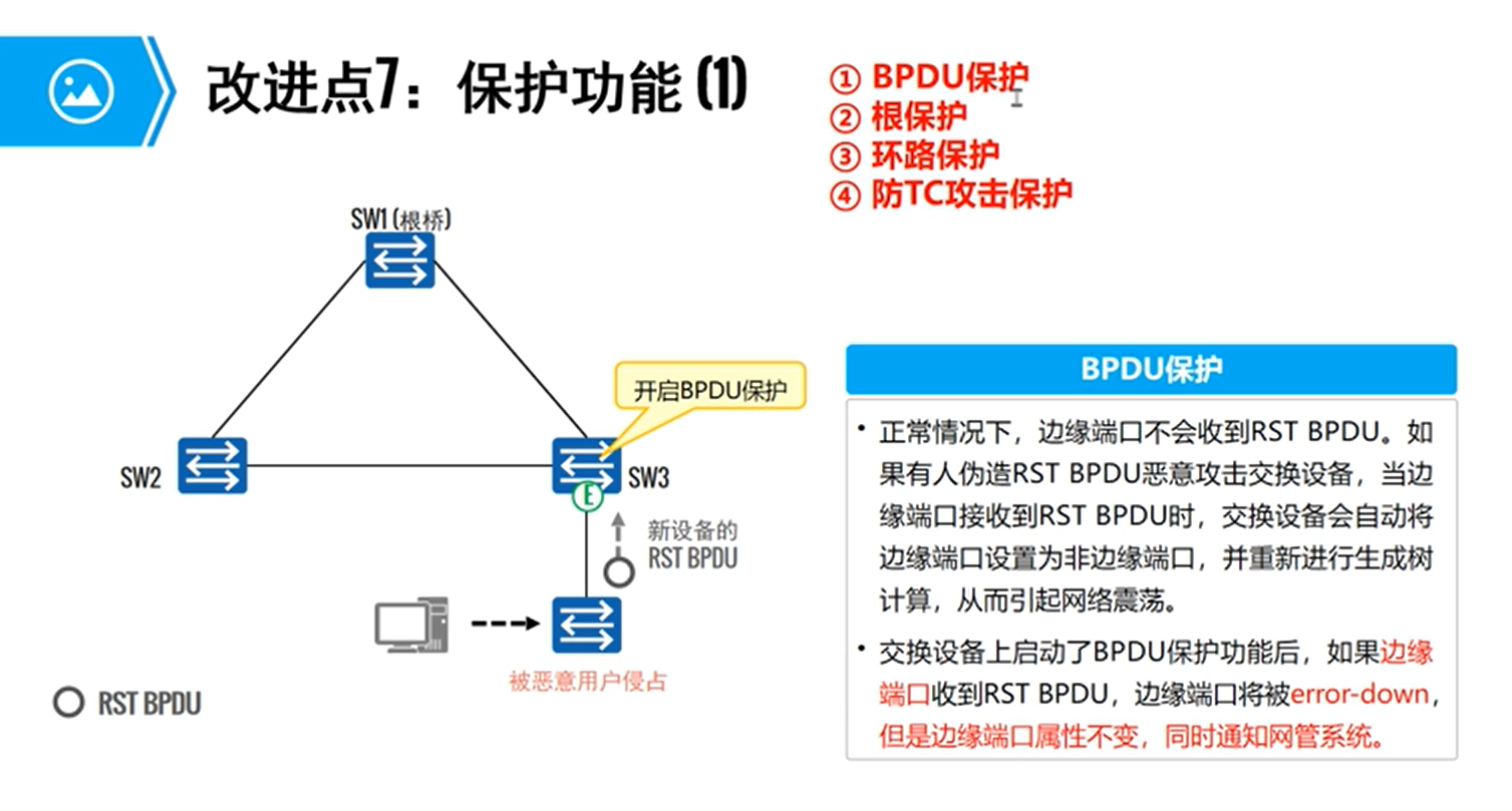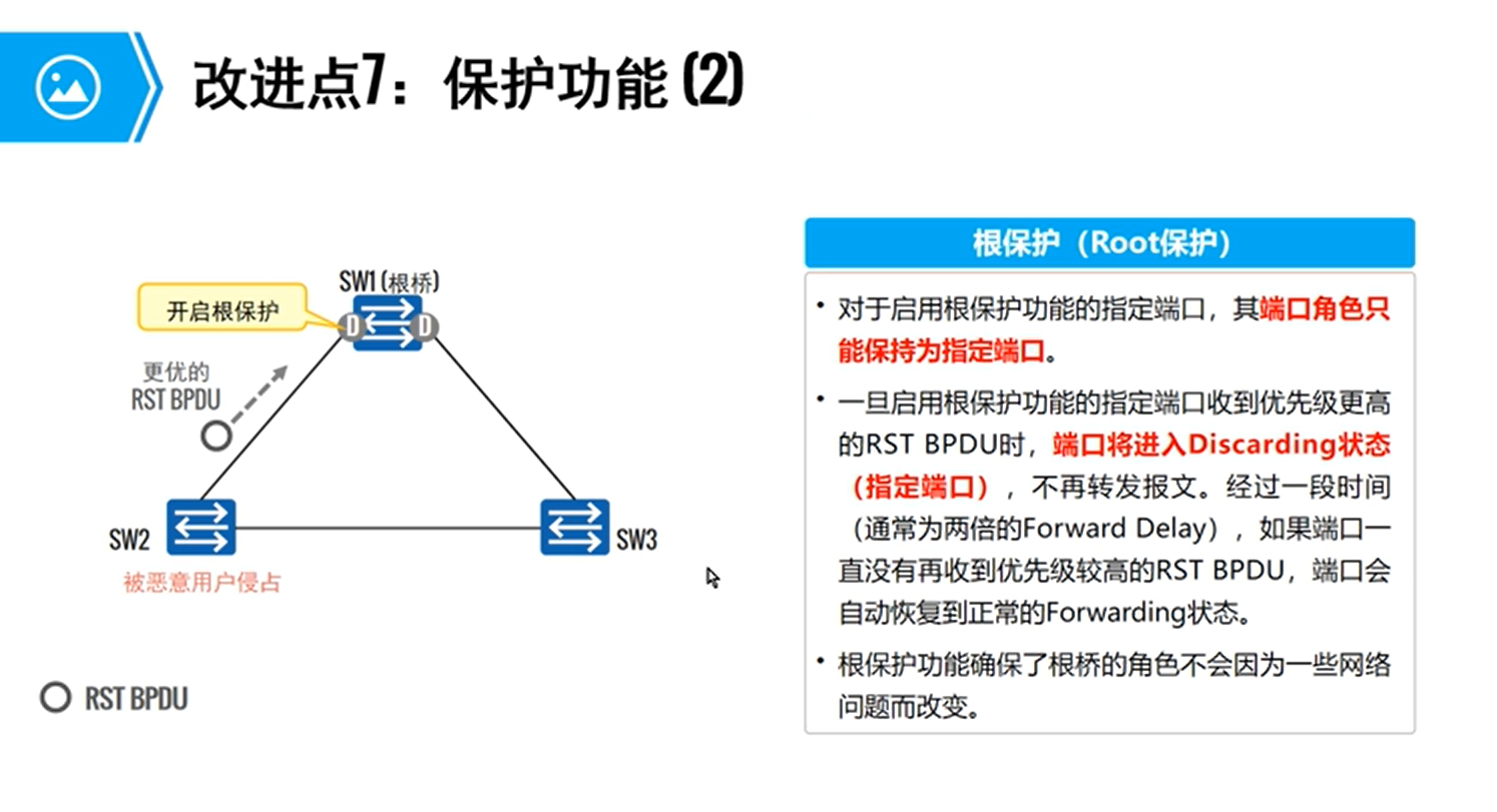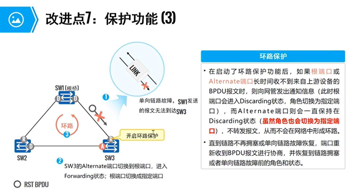 只在根端口或alternate口启用环路保护功能,启动后如果长时间收不到根桥的BPDU,则启动环路保护功能,根端口处于discarding 状态, alternate口处于转发状态,即自动关闭没有收到BPDU的根端口,开启alternate口。