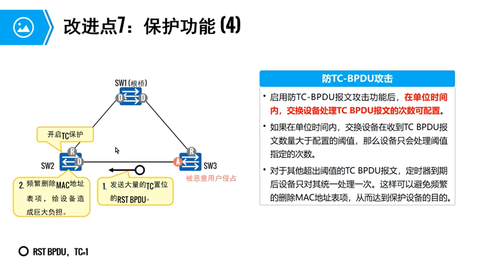 全局配置: stp tc-protection threshold xxx 单位时间 2 秒内处理多少TC报文