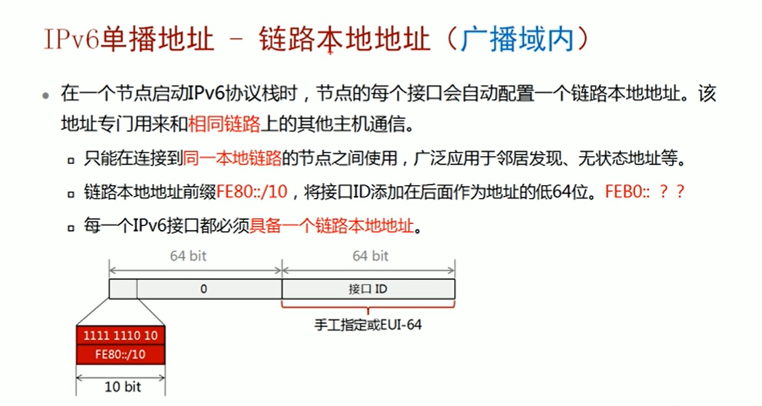 链路本地地址 仅在 该段链路有效,无法跨网段使用,FE80:: 开头