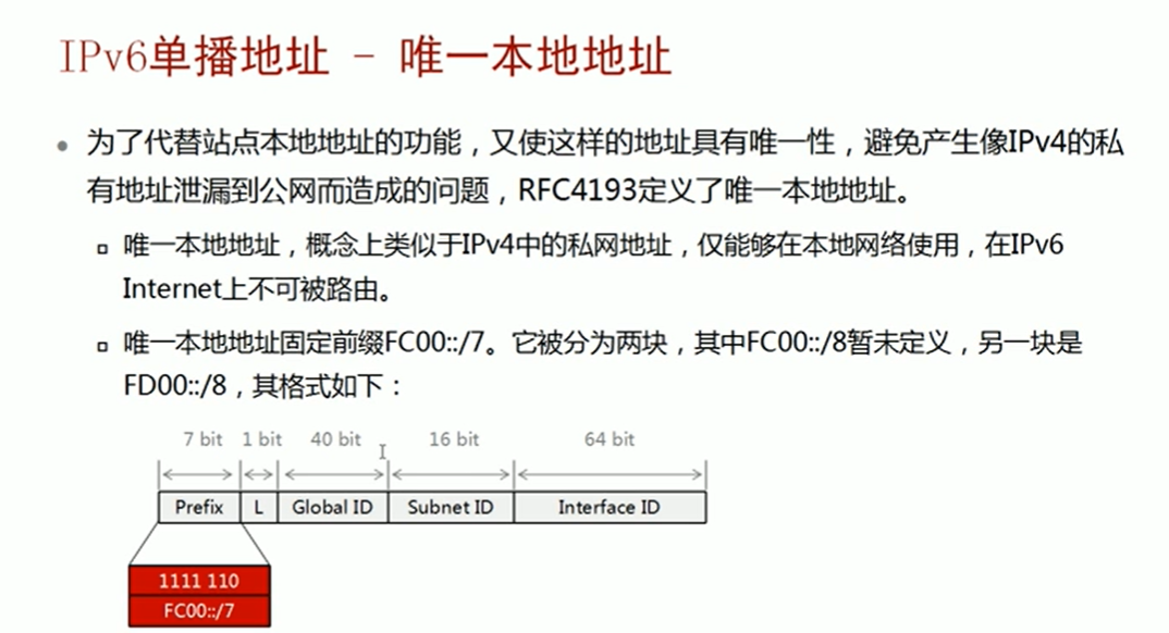 唯一本地地址:相当于IPv4的私有地址,192.168.x.x,